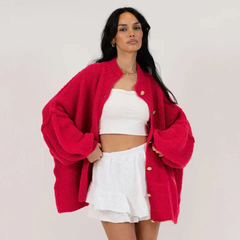The perfect blend of cozy comfort and everyday elegance. Its thick and fluffy knit wraps your body in comforting warmth, ideal for chilly autumn and winter days. The oversized cut with batwing sleeves creates a fluid and modern drape, while the golden buttons add a refined and bright touch.